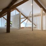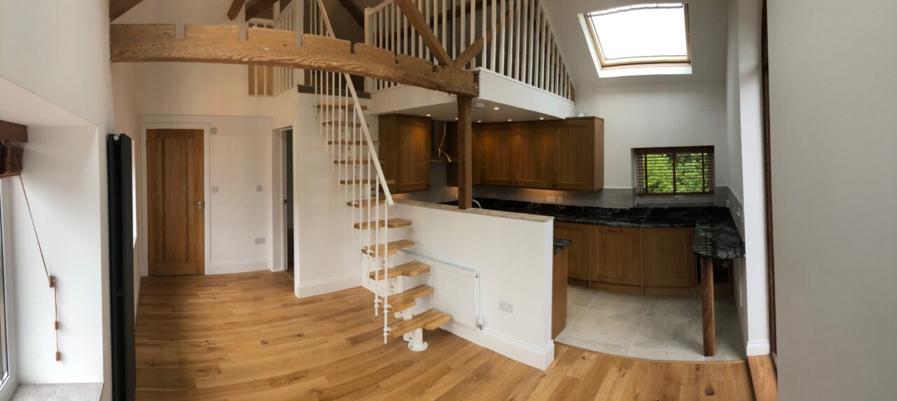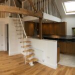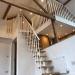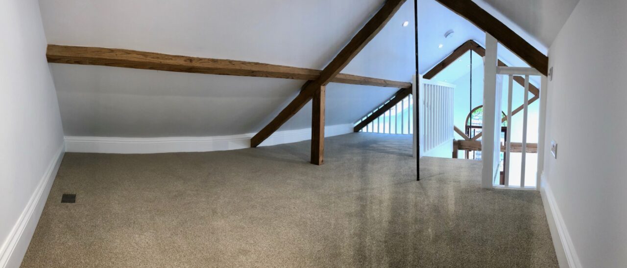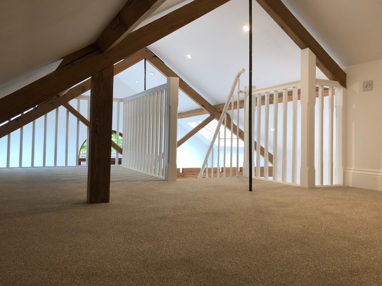Up a small modern, space-saving, staircase is a substantial balustraded mezzanine.