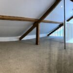 The bathroom has a shower/bath under a high ceiling with velux window.