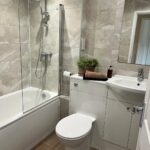 Fully tiled bathroom with shower over bath and heated towel rail.