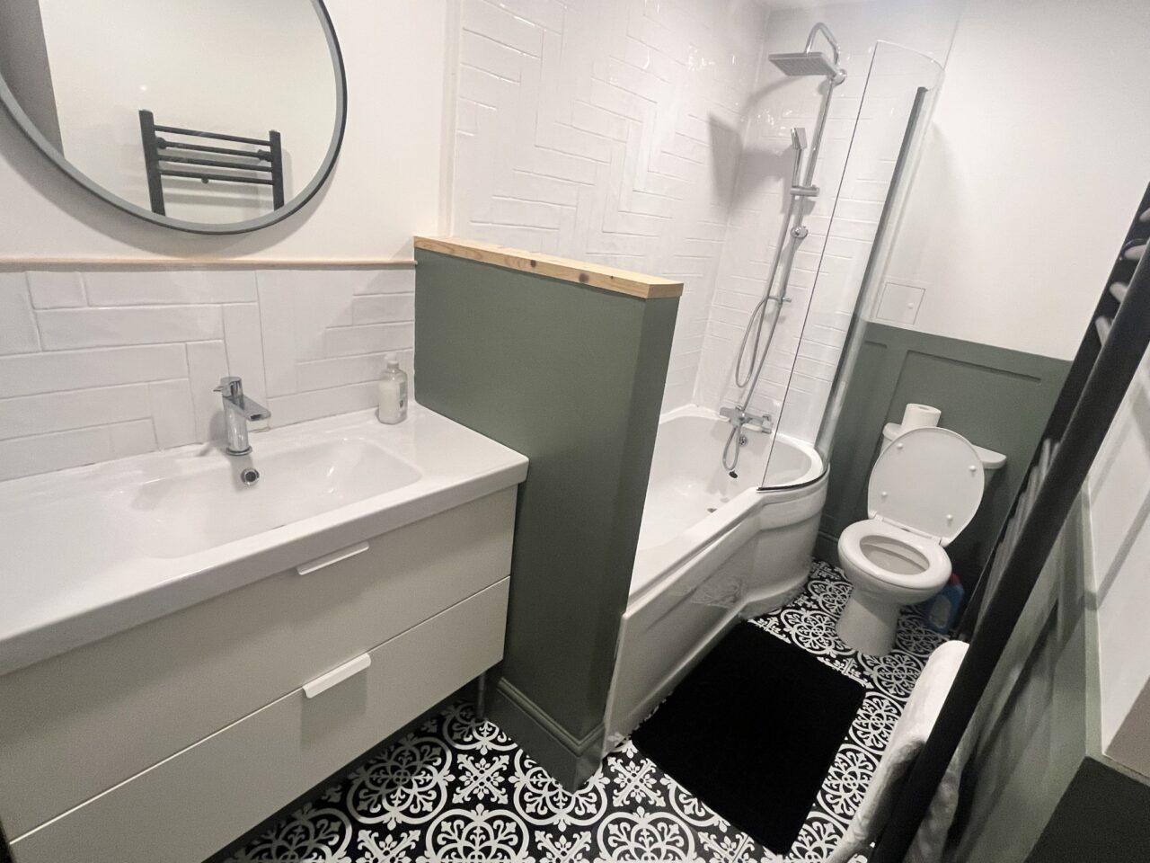 The modern bathroom features a bath/shower, light up mirror and heated towel rail.