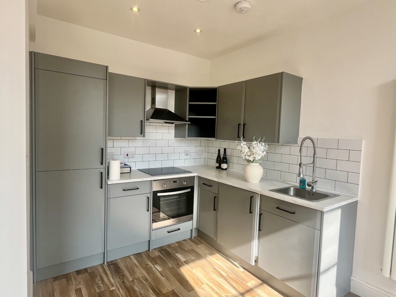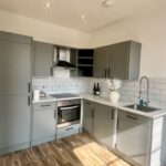 The kitchen features an integrated oven, fridge, freezer and washing machine/tumble drier.