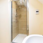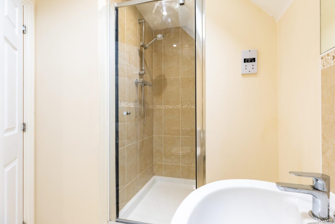 There are two well-proportioned bedrooms. The master bedroom benefits from built-in storage and a private en-suite shower room, while the second bedroom provides a versatile space suitable as a guest room, home office, or additional double bedroom. A separate family bathroom, complete with a full-size bath and overhead shower, serves the rest of the property.