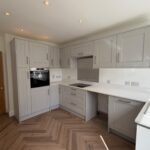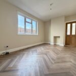The ground floor comprises a spacious reception room with attractive herringbone-style flooring, leading through to a contemporary kitchen fitted with sleek cabinetry, integrated appliances, and direct access onto a private rear garden perfect for both everyday living and entertaining.