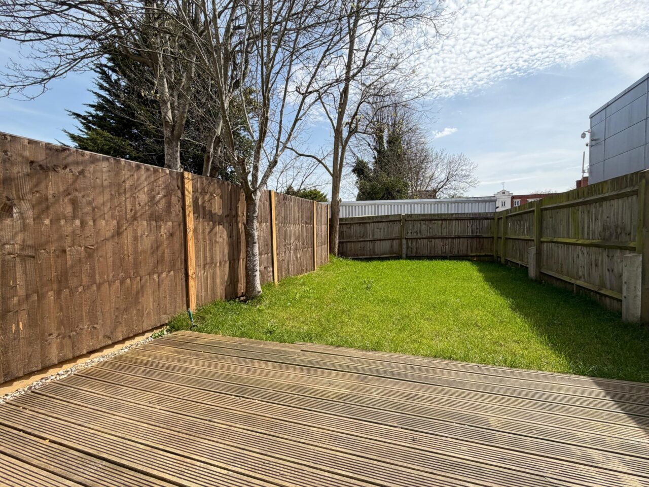 A standout design feature is the stylish vanity area with herringbone tiling, adding a unique and contemporary touch. Externally, the property benefits from a private rear garden with decking and lawn, providing a practical and low-maintenance outdoor space.
