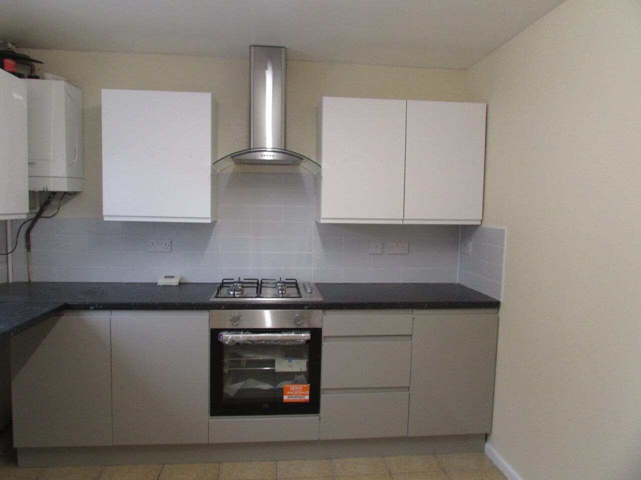 A new Wickes kitchen with with gas hob and electric oven and cooker hood with space & electrics for dish washer, washing machine & fridge freezer and tiled floor. The house has been renovated and redecorated including new carpets and curtains to all rooms except the hall which has wood engineered flooring.