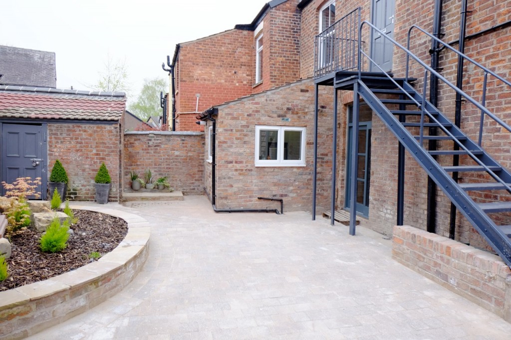 Access to flat is through locked gate with intercom, via small walled courtyard with external metal staircase to first floor flat.