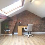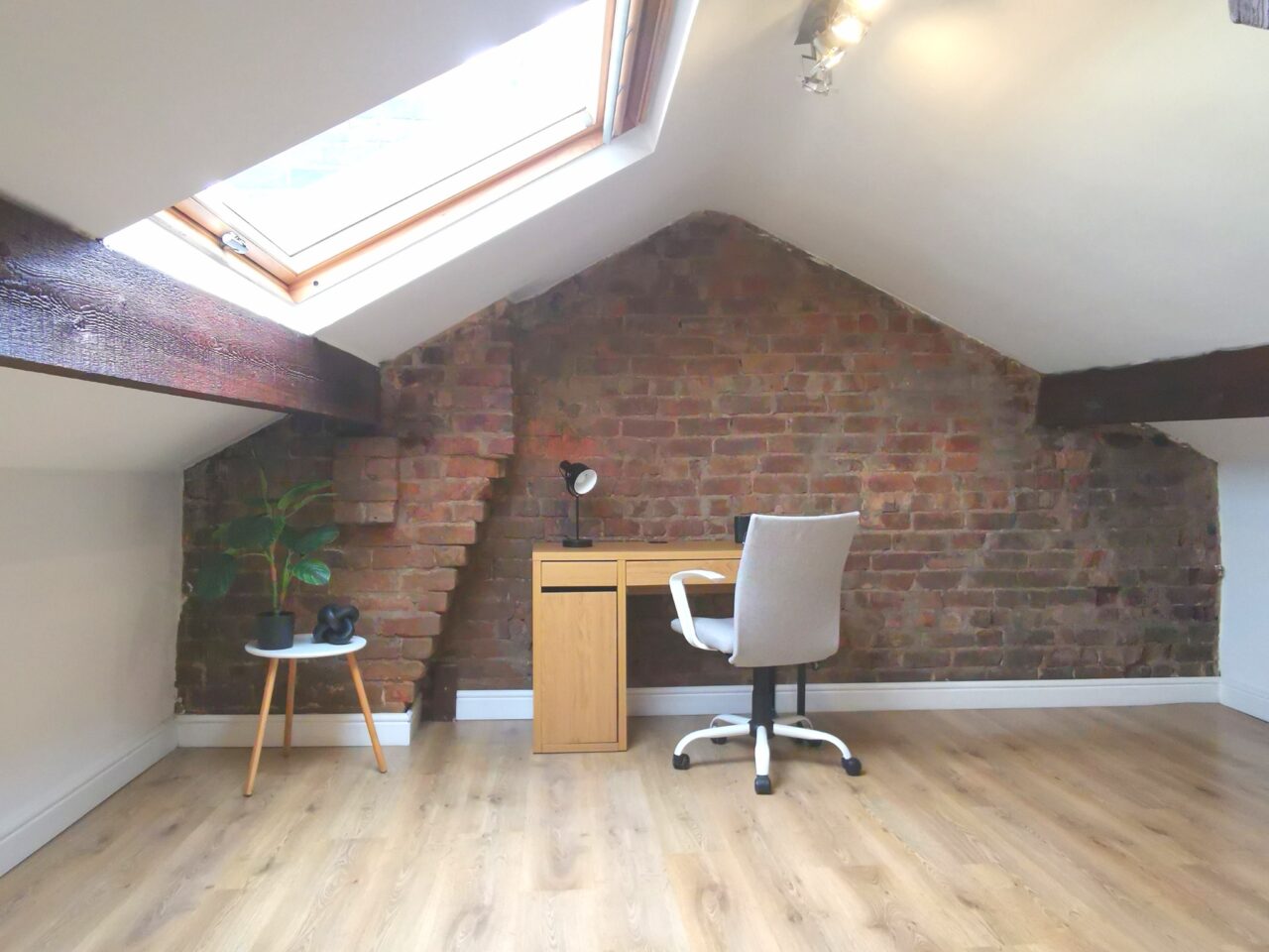Loft Room – Large loft space with large under eaves storage cupboards, radiator, contemporary exposed brick wall and large velux window.