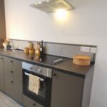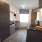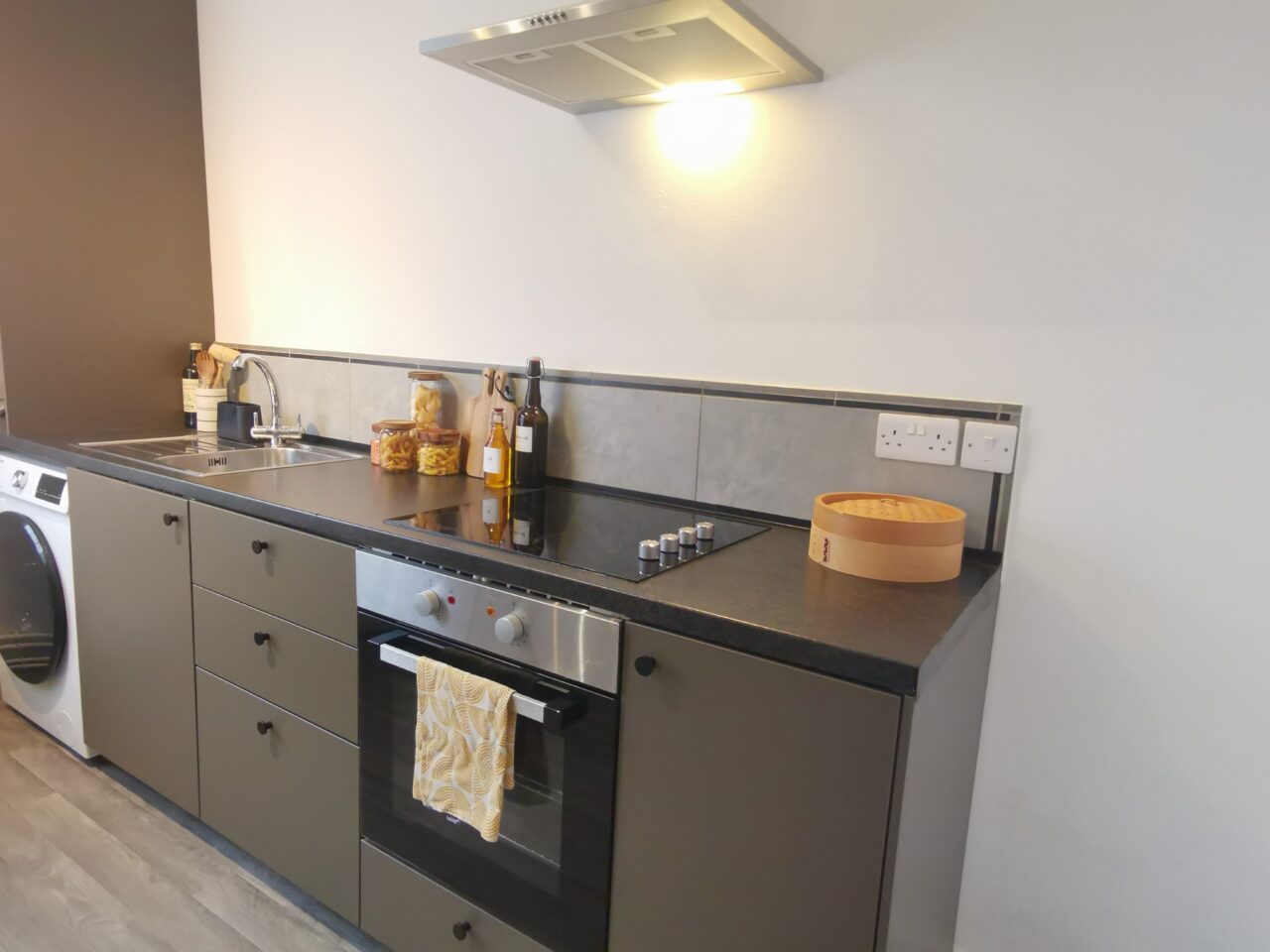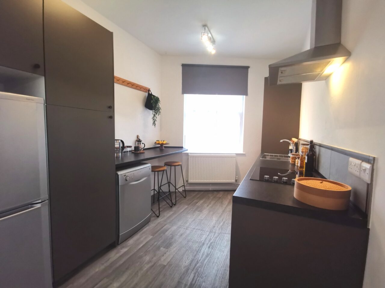 Kitchen – Modern fully fitted kitchen with integrated four ring electric hob and electric single oven, dishwasher, washer dryer and fridge/freezer. Vinyl flooring throughout. Breakfast bar, ceiling spotlights and roller window blind. Gas central heating with efficient condensing combi boiler.
