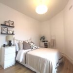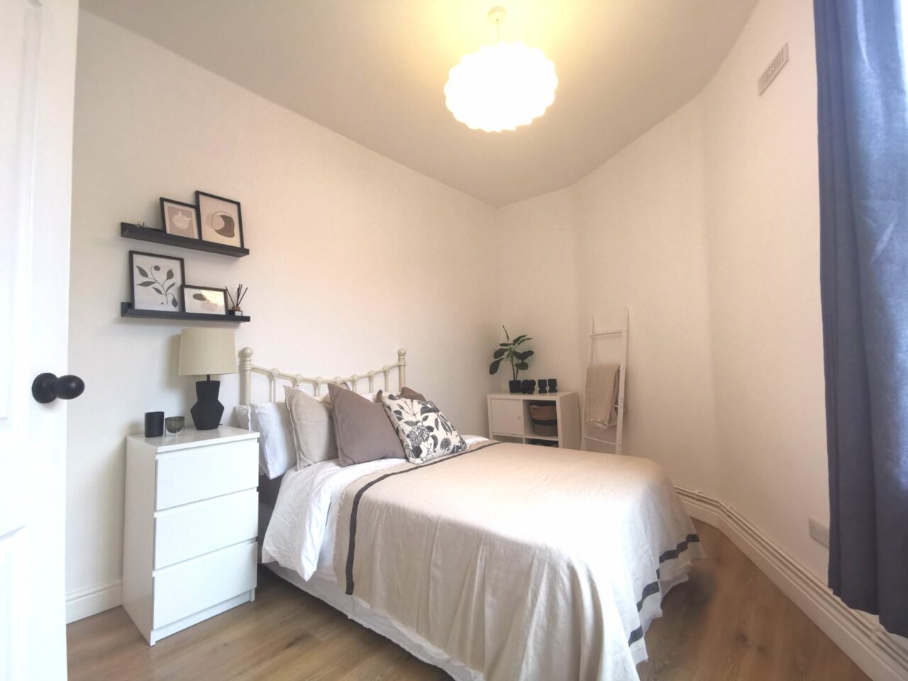 Bedroom 2 – Double bedroom with curtain pole, curtains, and window blind. Double radiator, large double glazed sliding sash, laminate oak flooring.