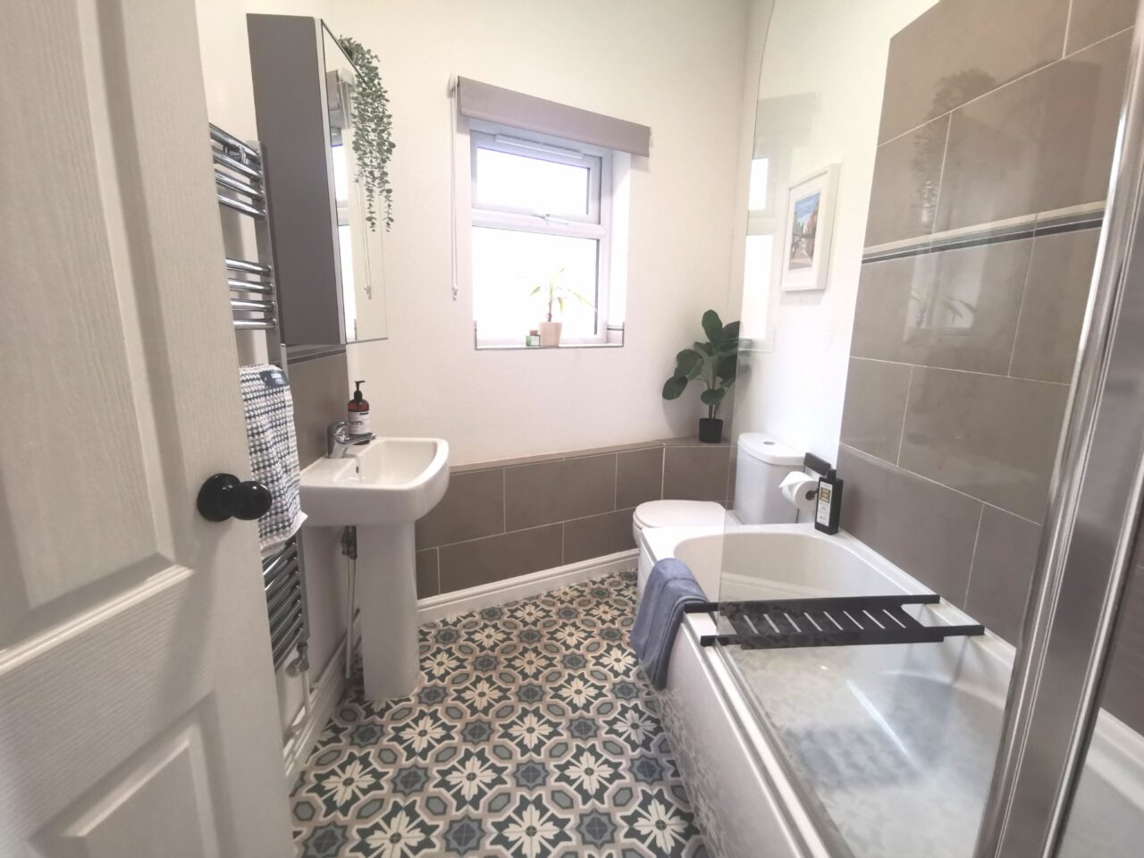 Bathroom – Contemporary fully fitted bathroom suite in white with toilet, hand wash basin and bath with shower over, glass shower screen, lino flooring throughout.