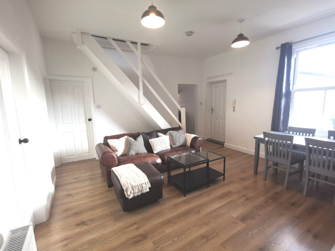 Lounge/ Dining – Great sized lounge with large double glazed sliding sash window, modern electric fire, room for dining table, large leather sofa, laminate oak flooring and stairs to loft space.