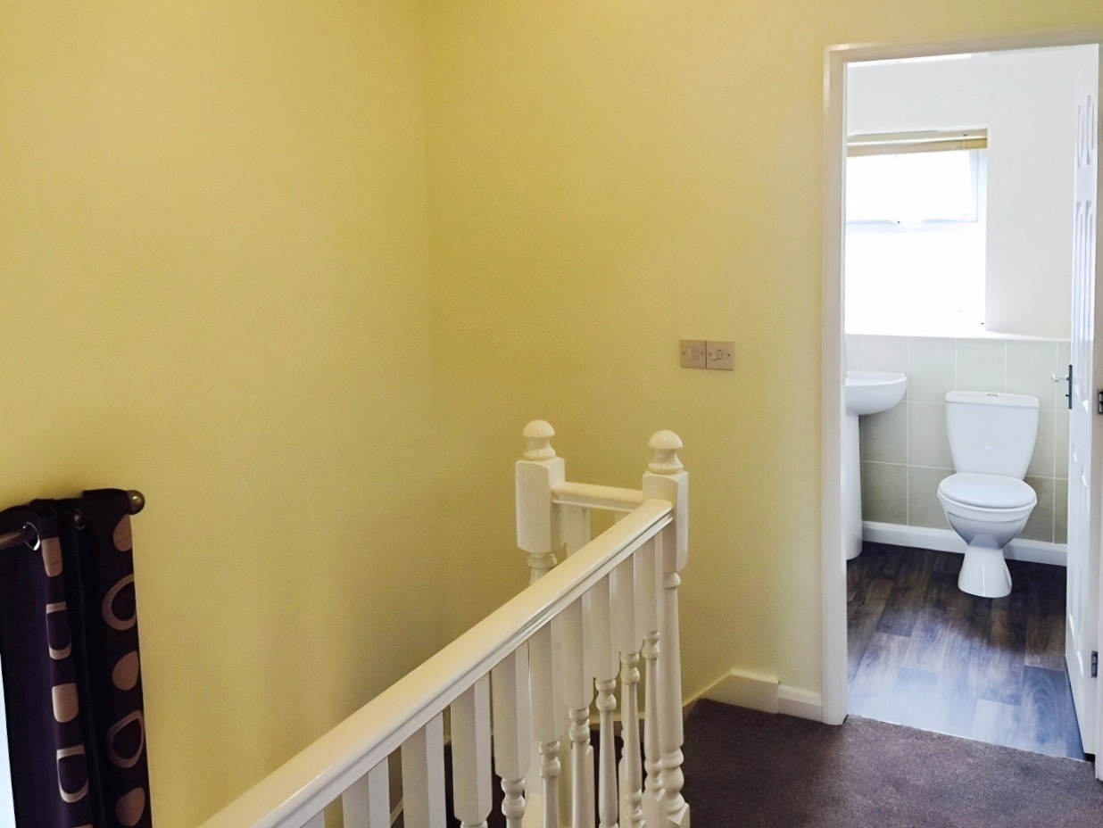 Landing leading to “L” shaped lounge/diner with Juliet balcony, breakfast/dining kitchen complete with gas hob, electric oven and plumbing for dishwasher.
