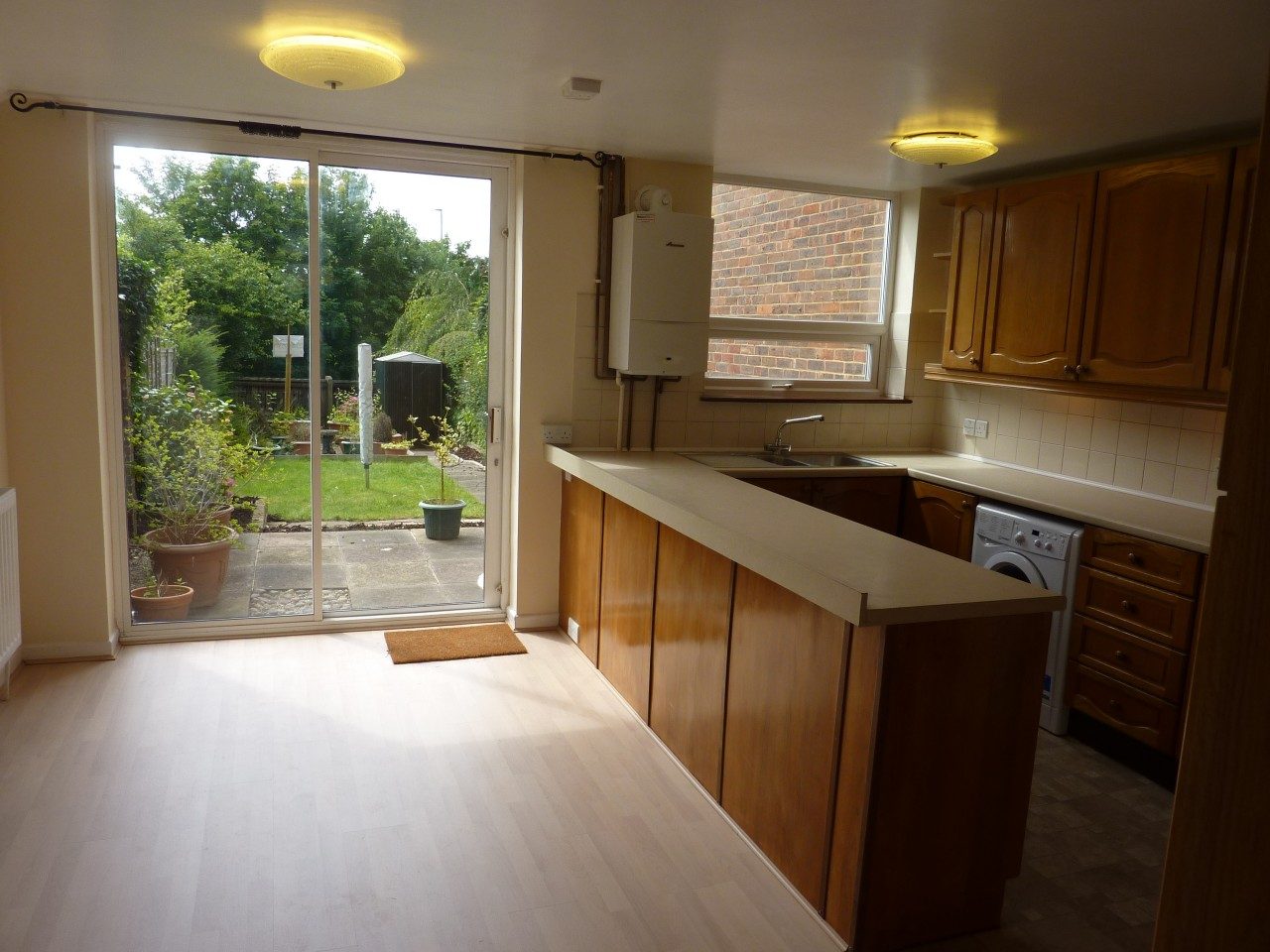 Features include downstairs WC, fitted kitchen and open plan lounge/dining area with sliding patio doors leading onto a large garden with patio and lawn.
