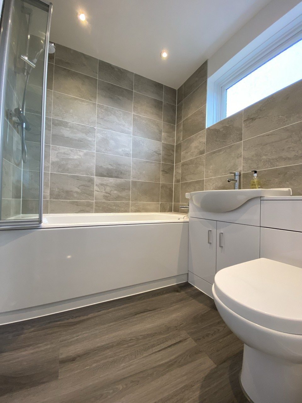 Double glazed window, bath with shower over, toilet, wash basin, vanity unit , heated chrome towel rail., tiling to walls, extractor fan, recessed spot lights