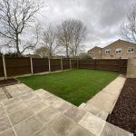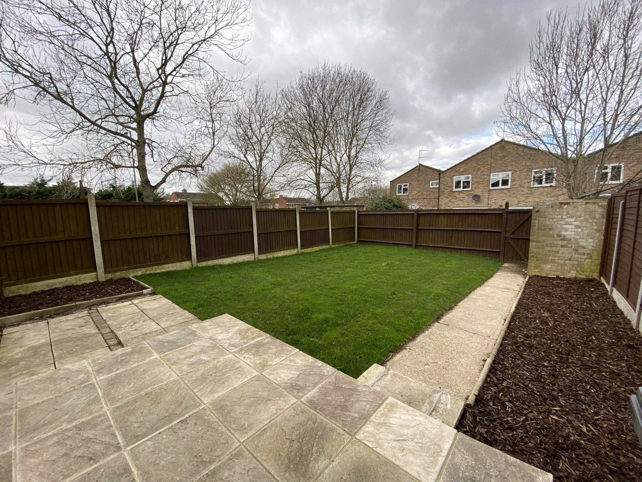 Patio area, lawn, pathway to gate and brick shed