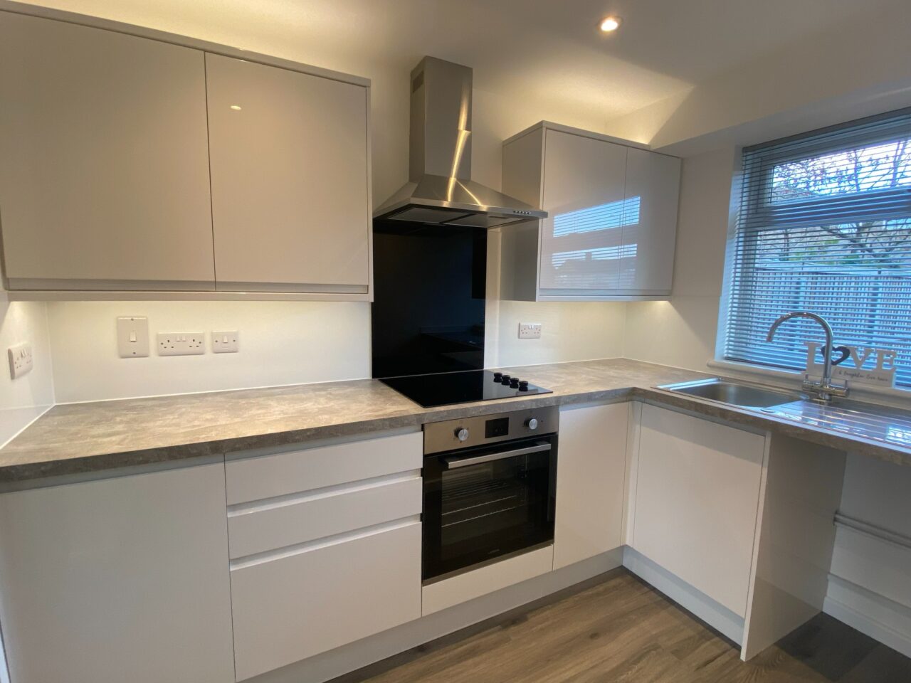 Double glazed window overlooking front garden, the kitchen includes a range of wall and base units, integrated oven, ceramic hob, extractor hood, gloss splashbacks, space for washing machine and large fridge/freezer , luxury vinyl tile flooring, the wall has been opened up into dining room, which is ideal for socialising whilst preparing meals, or keeping an eye on the children, recessed spot lights and under counter LED lights