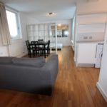 Wood flooring, white painted walls, 2 sets of cream curtains, 2 chrome light fitting (3 spots in each), 2 radiators, TV & Tel points, entry phone, chrome light dimmer switch, Hager fuse box fitted on wall, 3-door mirrored free standing wardrobe with hanging rails and shelving, 3-seater sofa, dining table and 4 matching chairs, large white free standing bookcase/room-divider, large wall mirror fitted to wall, double bed in white frame with mattress, headboard and 2 bedside tables (drawer in each).