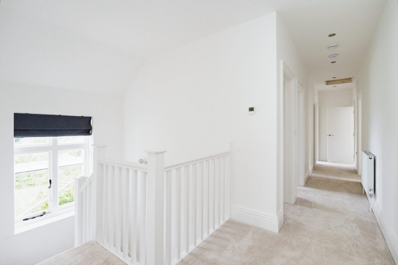 A spacious landing with window to rear garden, single radiator, large storage area, loft access, carpeted floor finishes.