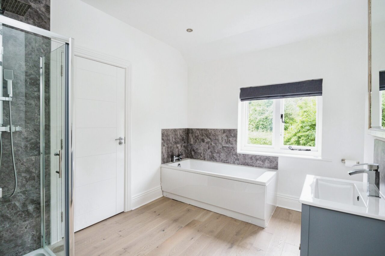 Panelled bath with chrome taps, wash hand basin inset to vanity unit, large shower cubicle with chrome fittings and glass door, low level WC with push button flush, single radiator, tiling to wet areas, window to front.