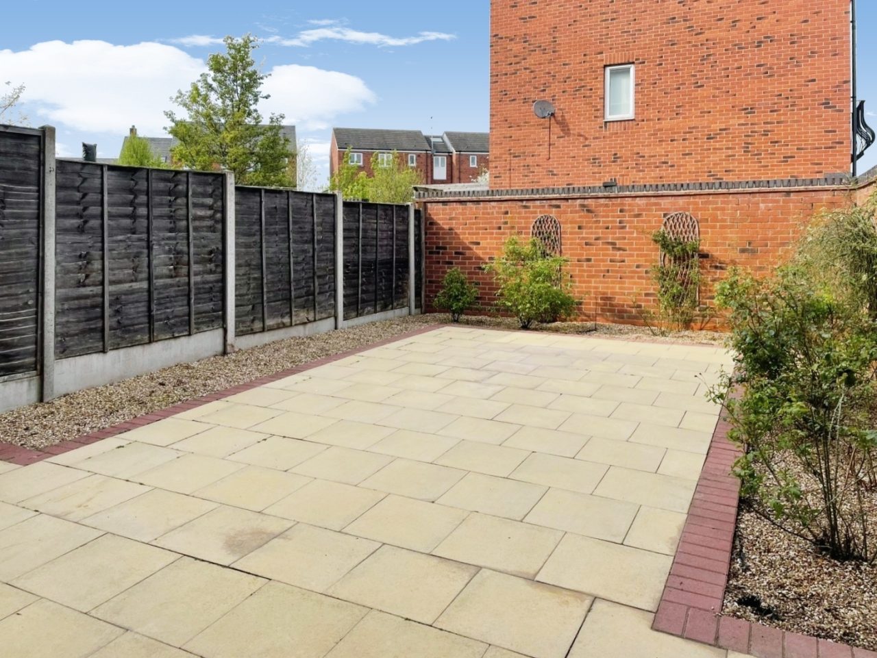 The property sits on a low maintenance plot with a slate chipped frontage and a paved pathway leading up to the front door. To the side, is effectively the back garden which is an enclosed plot which benefits from having a large paved patio with gravelled areas to either side with a range of mature shrubs. A gate provides rear access. There is also a tarmacadam parking space sitting to the front of the garage.