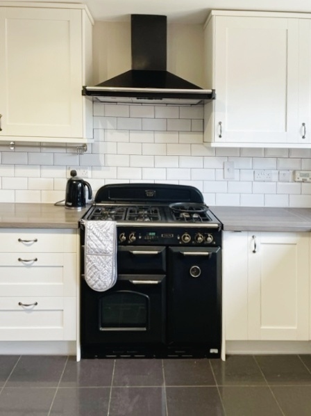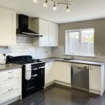 A recently refurbished contemporary kitchen/diner which comprises of a range of matching base cabinets and wall units. There is a built in fridge/freezer and a new dishwasher, spaces for washing machine, tumble dryer. Range style cooker with an extractor hood above. The kitchen is fitted with a tiled floor, radiator and a wall unit housing the gas-fired central heating boiler. There is also a side facing UPVC double glazed window and side facing exterior door with double glazed panel inset opening out to the garden.