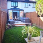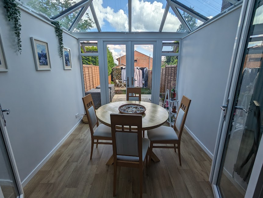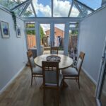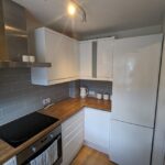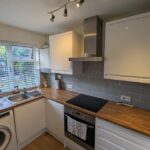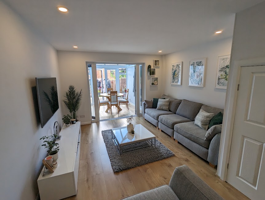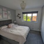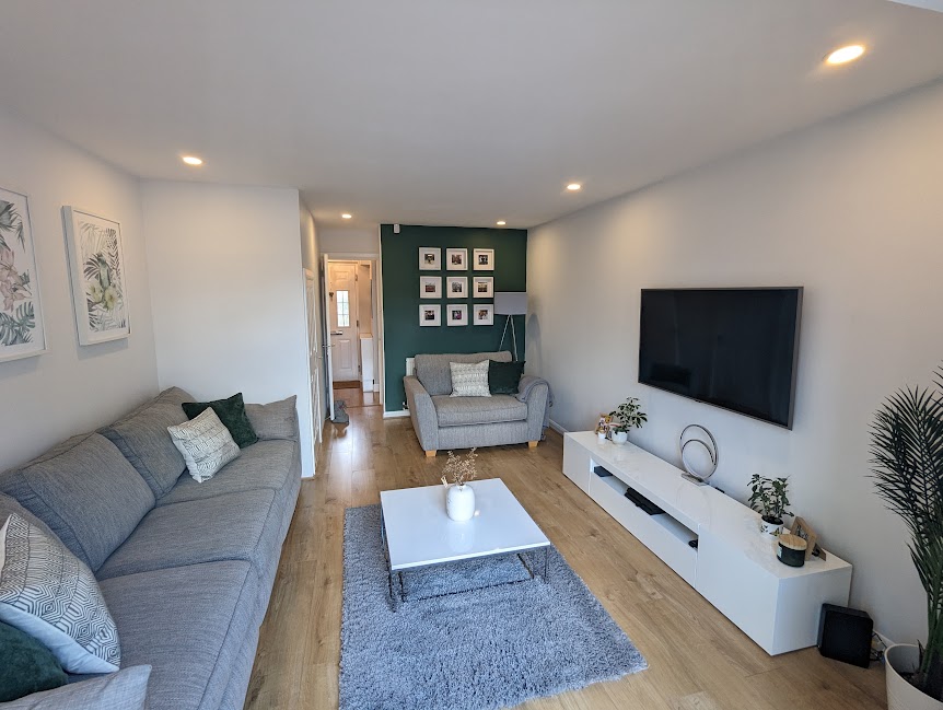Downstairs, this house has a welcoming entrance which leads into the Kitchen and Living Room. The Kitchen is modern with soft-close white gloss cupboards, a wooden worktop and induction hob. Additional items in the kitchen include the Zanussi oven and built in dishwasher. The Living Room is large, with space to mount a TV on the wall, there is also a large storage cupboard built in under the stairs. The Living Room has an emerald green feature wall and dimmable LED spotlights. The Living Room leads into the Conservatory, which can be used as a dining room, playroom or for extra seating. This lovely addition to the home lets in ample light as it’s south facing – it has built-in roof blinds to prevent it getting too warm in the summer. The downstairs has a wooden floor throughout.