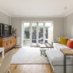 Open plan kitchen-living room on the ground floor with French Doors opening out onto a waterside garden