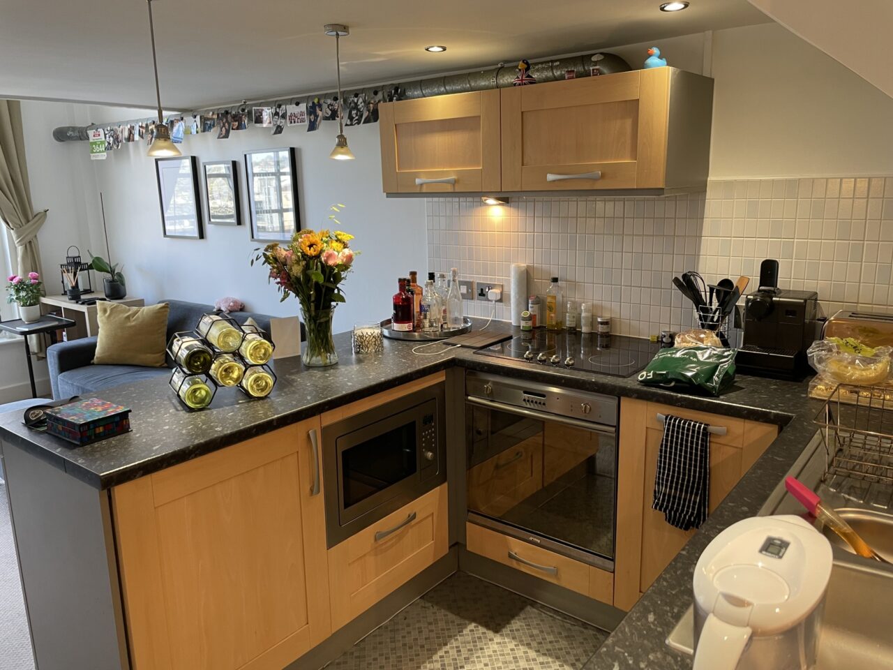 The apartment is part furnished with open plan living and kitchen area including a sofa and a breakfast bar. The kitchen has ample worktop and storage space and integrated appliances including electric oven and hob, dishwasher and washer drier. Also as an additional benefit there is downstairs toilet with a large useful storage cupboards downstairs.