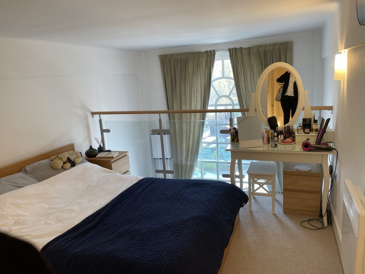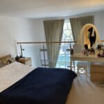 Unusually the apartment has spacious bathroom and storage cupboard upstairs and leads to chic bedroom with bed and bedside tables with large fitted wardrobes overlooking the living space.