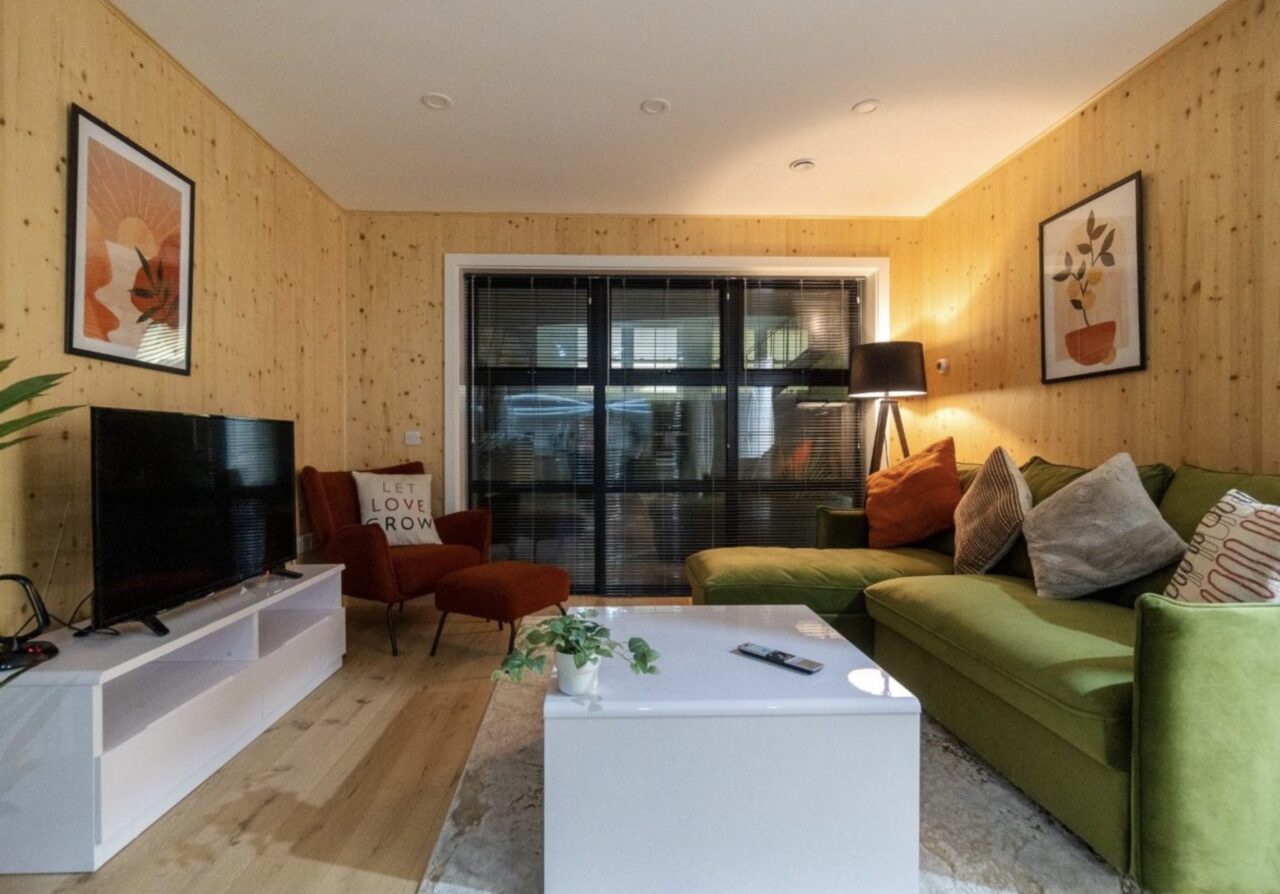Living area with dining table and chairs, luxury double sofa bed, comfy feature chair, smart TV, Coffee table.