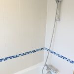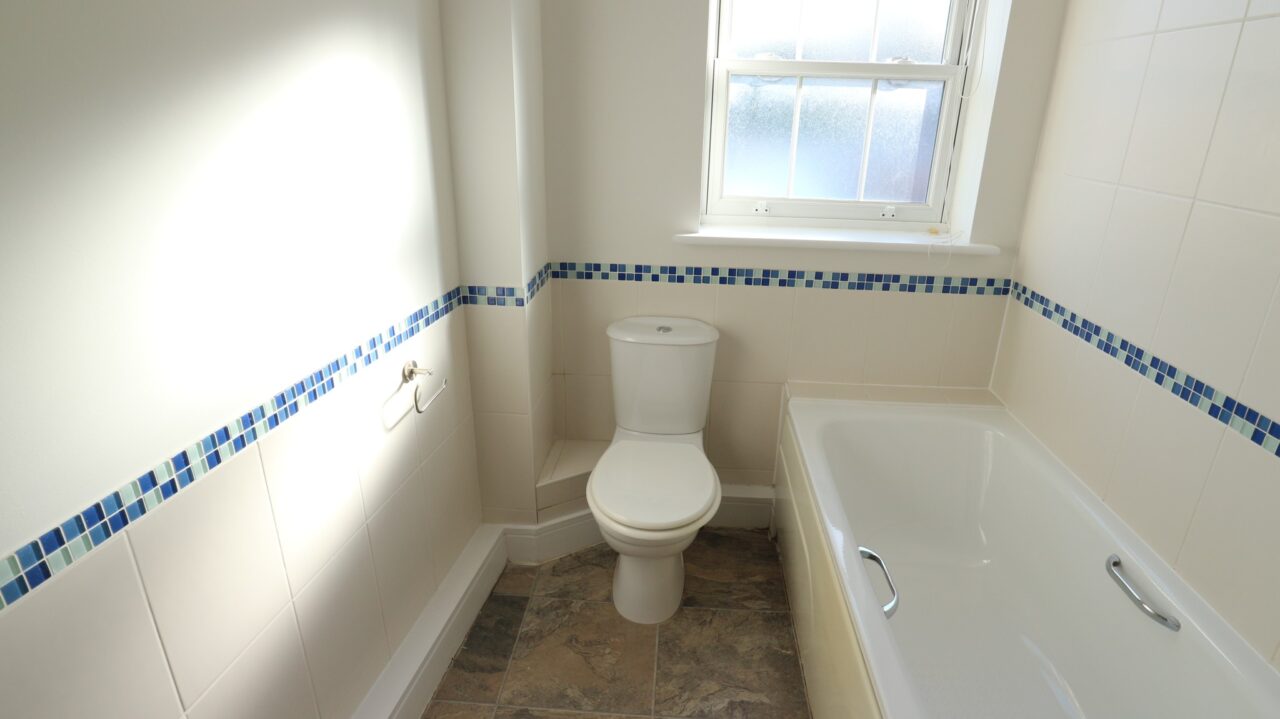 Family bathroom White suite, Lino tiled floor. Bath with shower mixer over and shower curtain rail. Pedestal wash basin, wc. Ladder radiator and wall mounted medicine cabinet.
