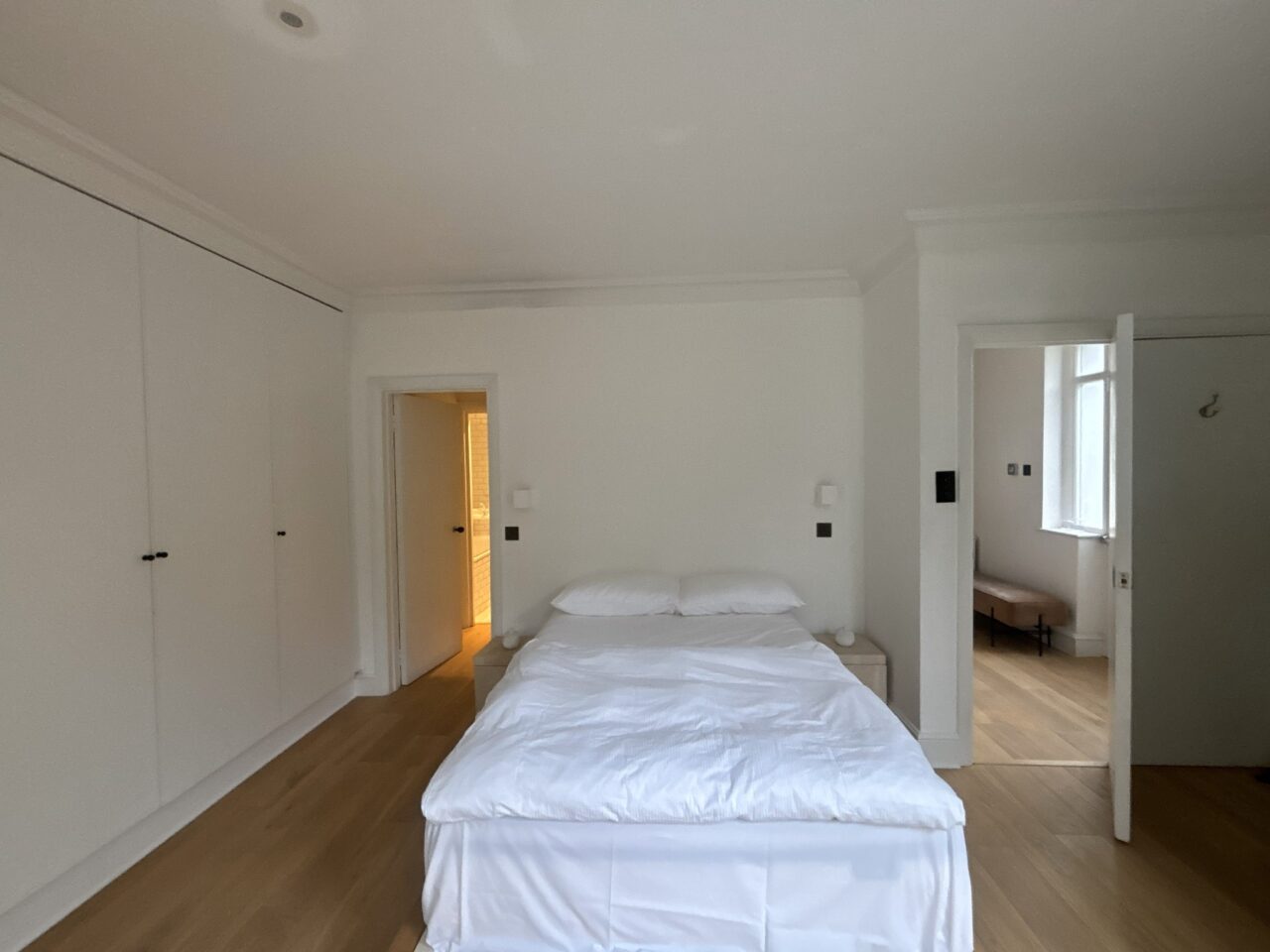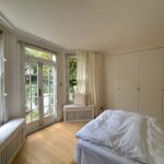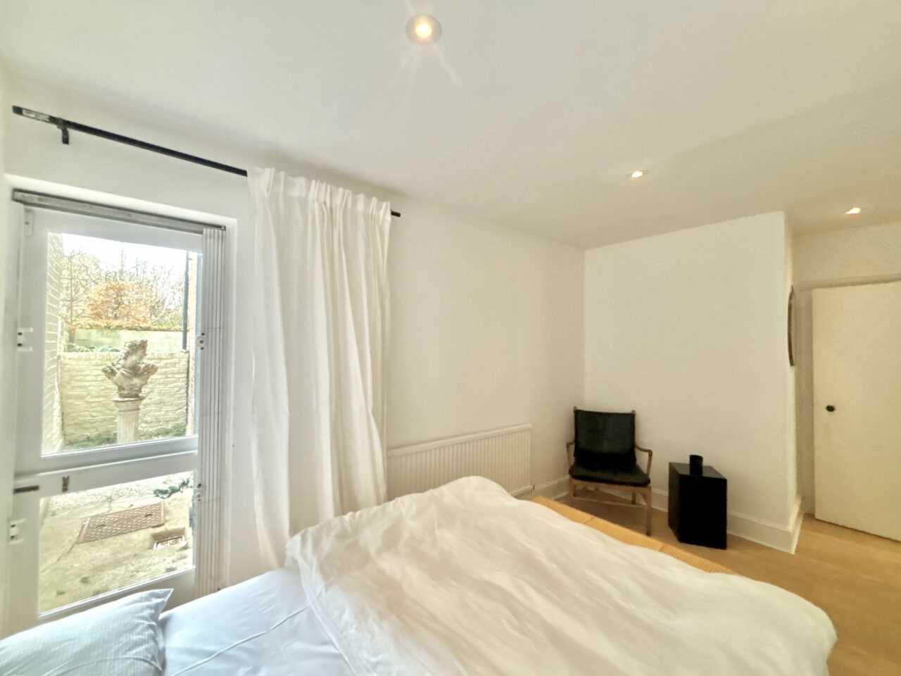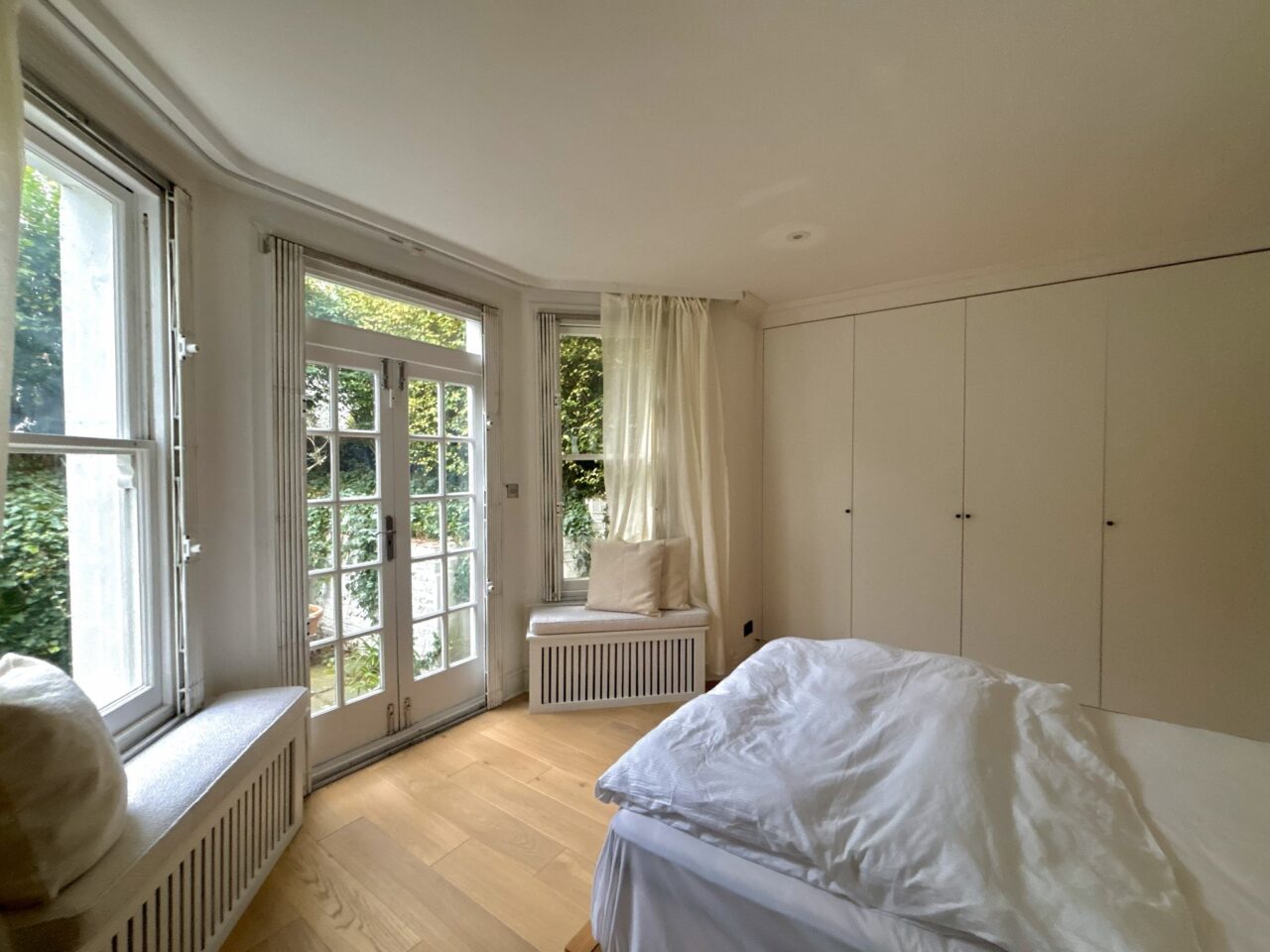 The master bedroom includes a walk-in wardrobe and an en-suite bathroom, with a large French window opening directly onto the garden, offering views of a private green oasis.