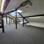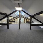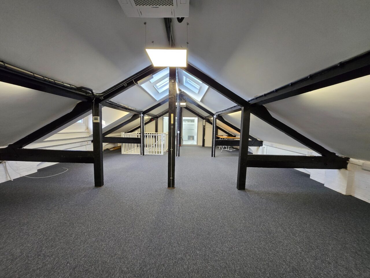 The office features a contemporary design with exposed beams, offering a stylish yet functional workspace. Ideal for businesses seeking a peaceful and well-connected location.