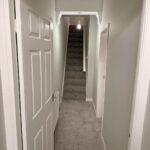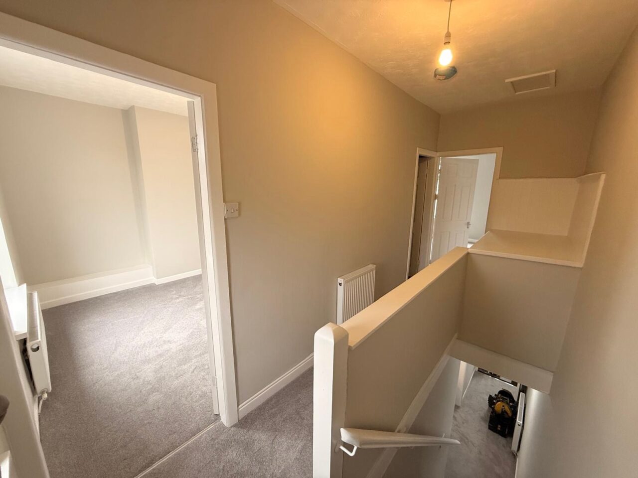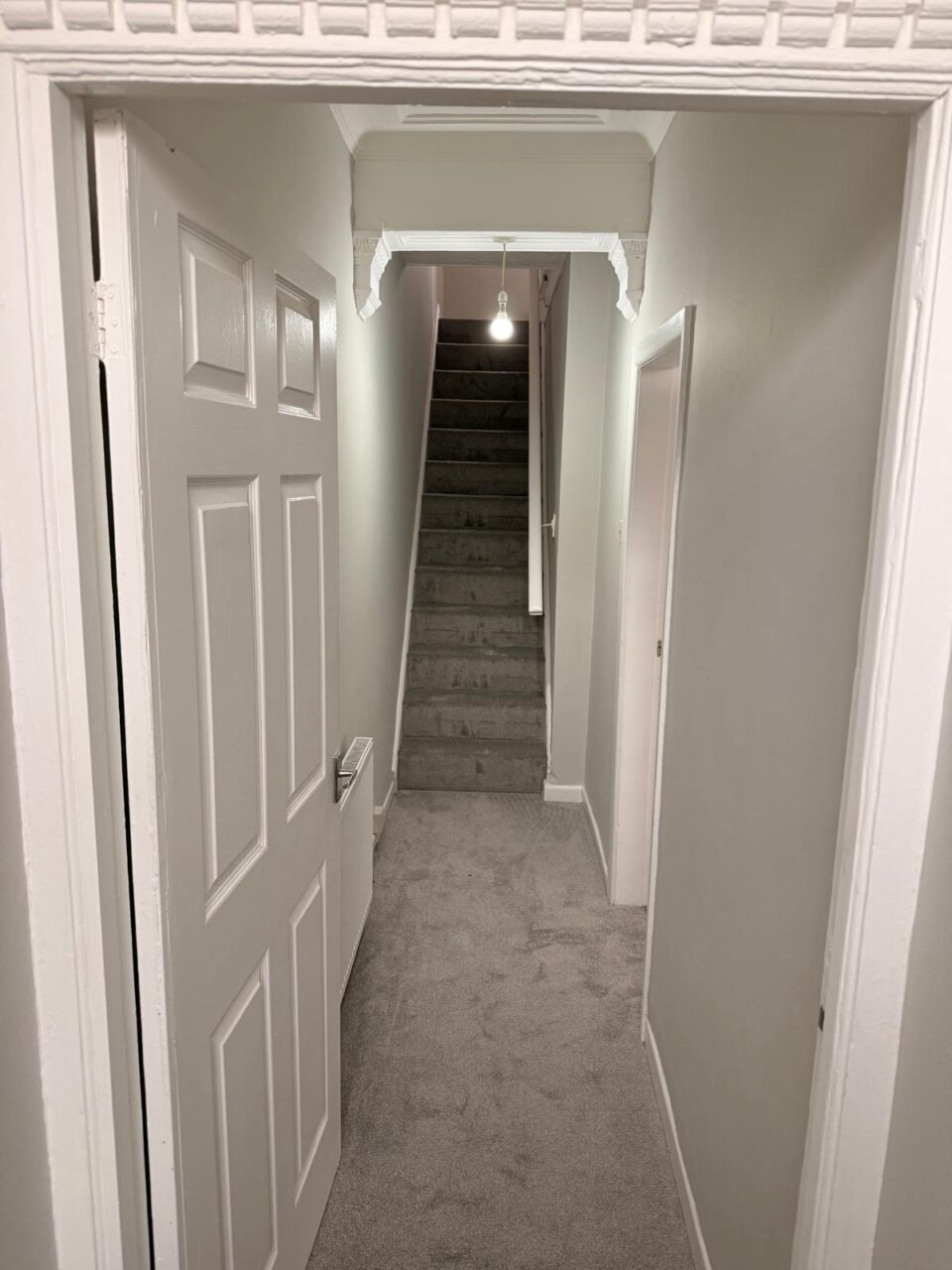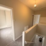 Brand New modern composite grey front door leading into a spacious hallway leading to stairs and spacious landing all newly carpeted in a modern light grey colour.