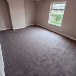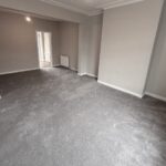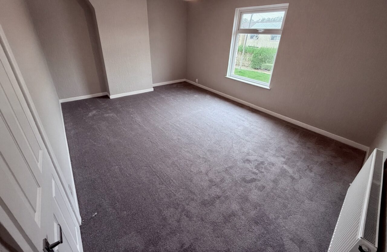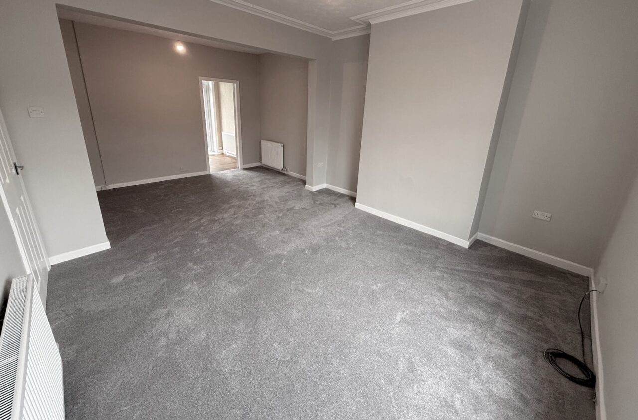 Large reception room with area for dining table with newly fitted modern light grey carpets.