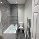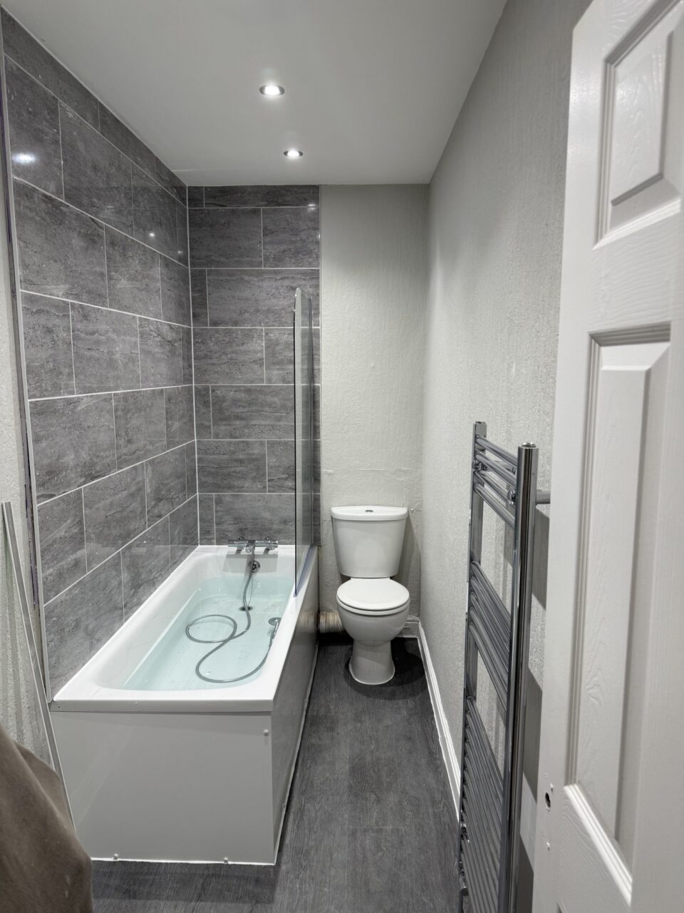 Stunning New bathroom with modern Dark Grey tiles and Dark Grey Modern Karndean style flooring. Built in sink with mirror and Vanity Unit. New Chrome heated Towel rail and modern spotlights to newly plastered ceiling.