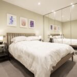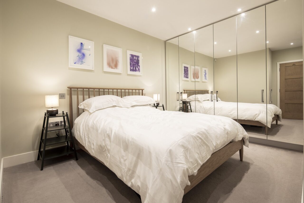 The master bedroom is a sizeable room with carpet and underfloor heating, full-width built-in wardrobes and cupboards with fully mirrored doors. Natural light and ventilation are to the private lightwell and the room is equipped with blackout blinds and sound insulation.