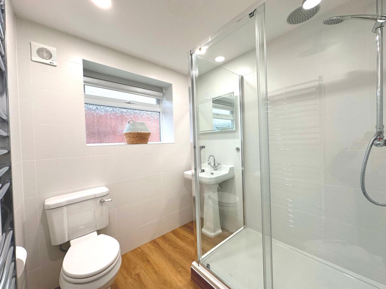 The downstairs bathroom is fully tiled throughout with a large thermostatic shower, toilet and basin. There is also a dual fuel heated towel rail and an LED demisting mirror.