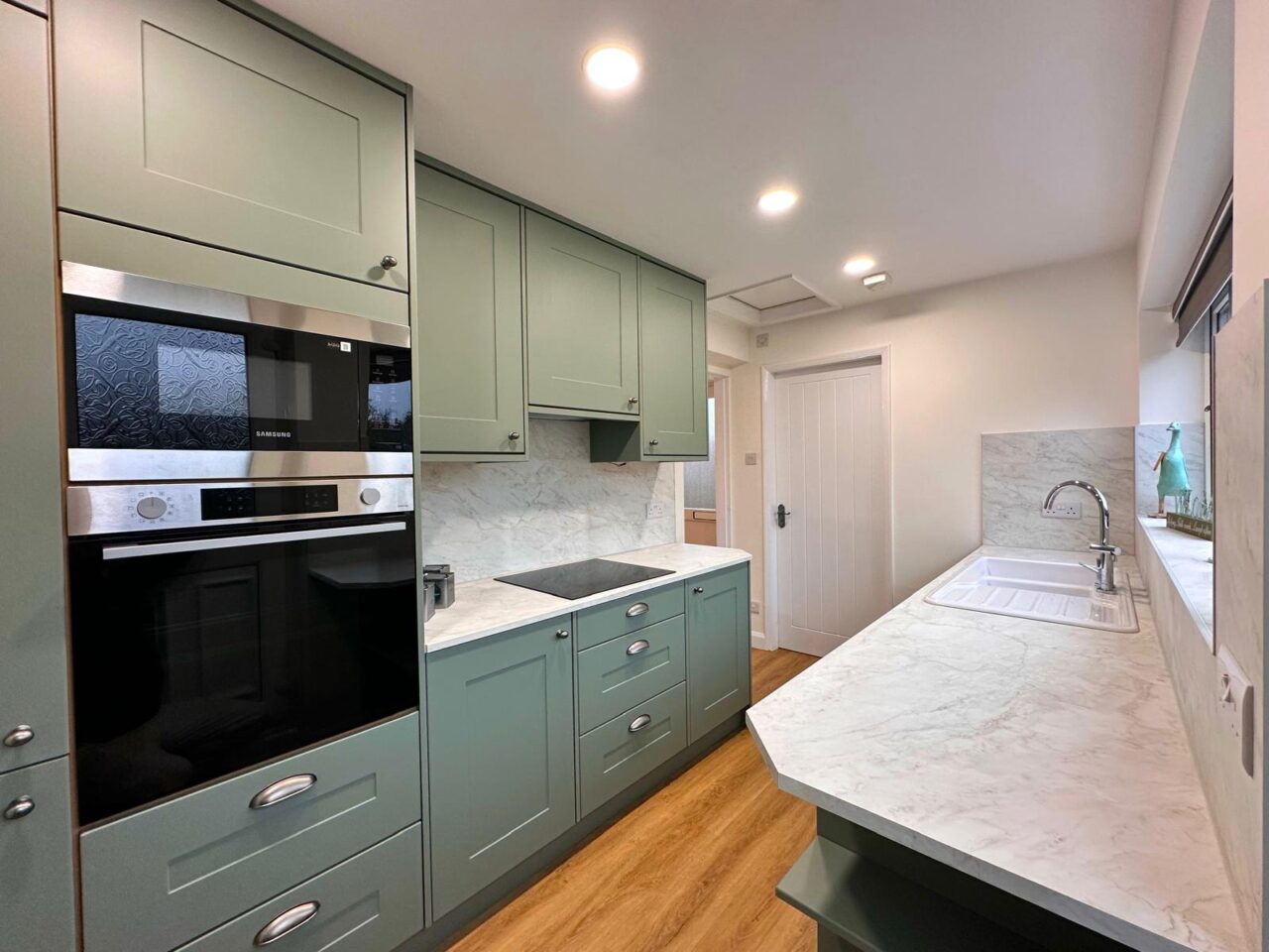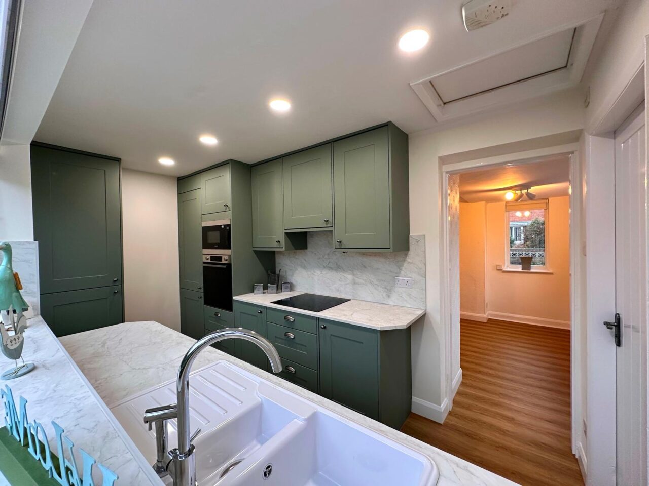 Newly-fitted kitchen with integrated dishwasher, washer/dryer, fridge/freezer, oven and microwave. The marble-effect worktop has a one and half bowl composite sink with a chrome mixer tap and separate spray nozzle. Ample cupboards and drawers for storage. Combi boiler.