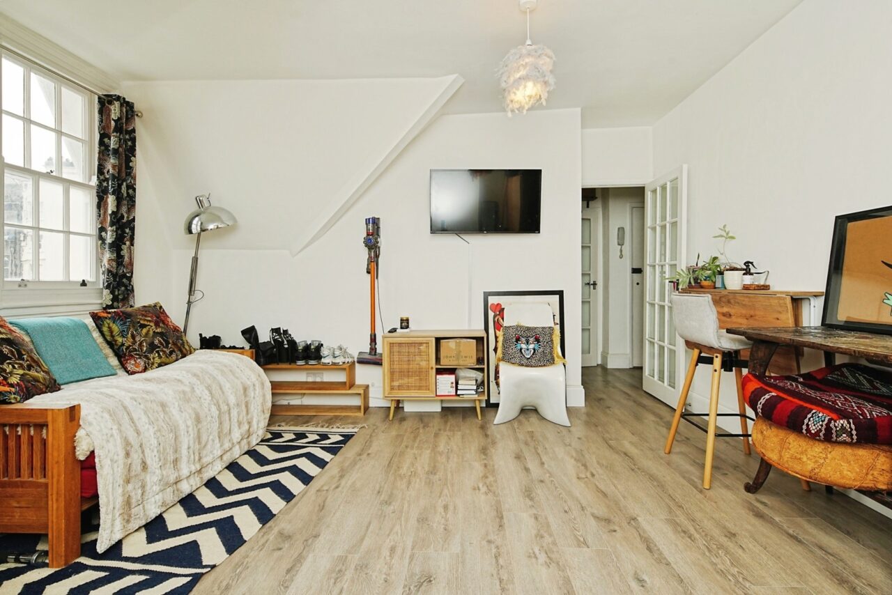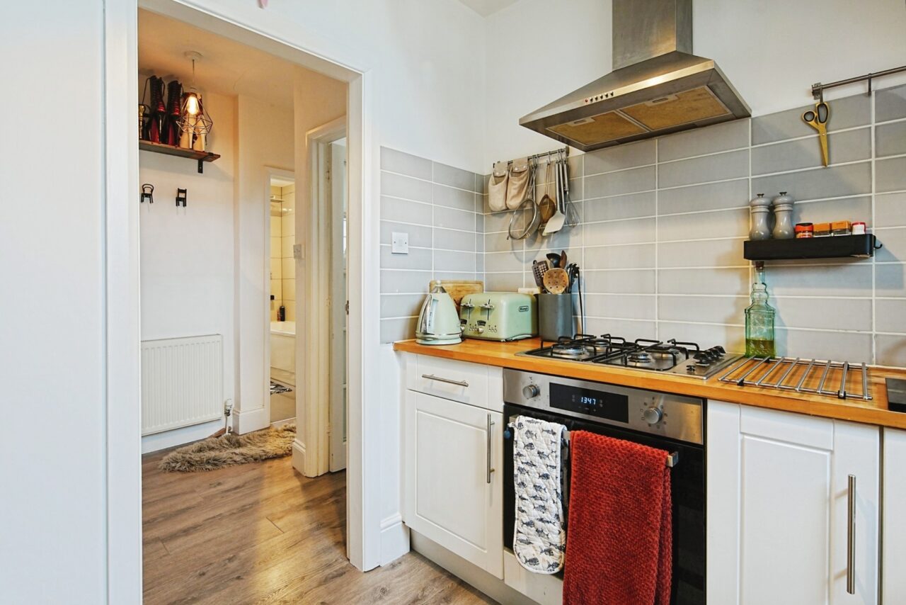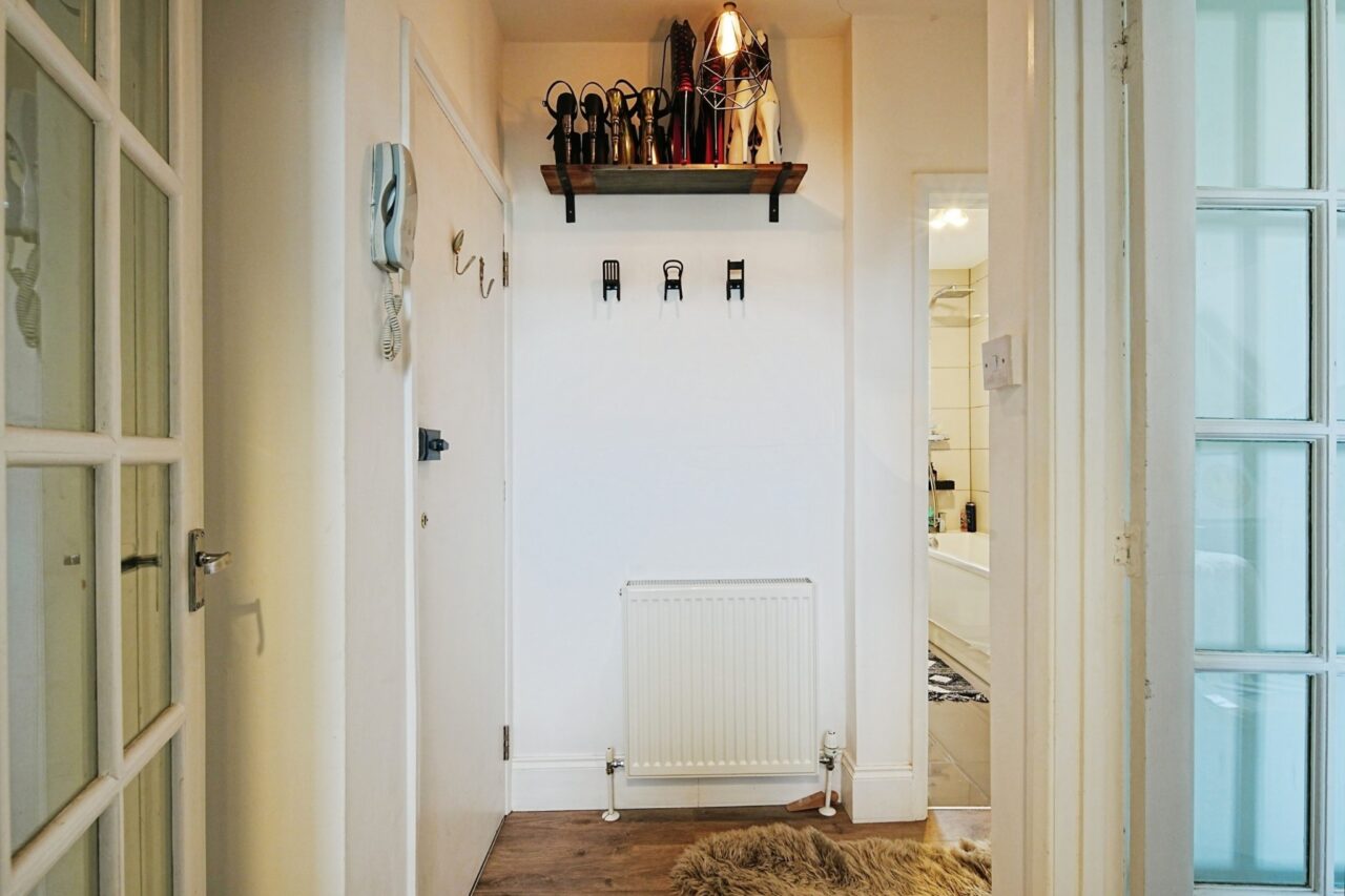 Upon entering this Victorian property, you are greeted by a spacious shared hallway, with stairs to the flat leading off it. The apartment itself is thoughtfully laid out, providing a welcoming and practical living space. On entering the flat, there is a small hallway with space for hanging coats, a useful shelf and a built-in storage cupboard.