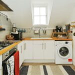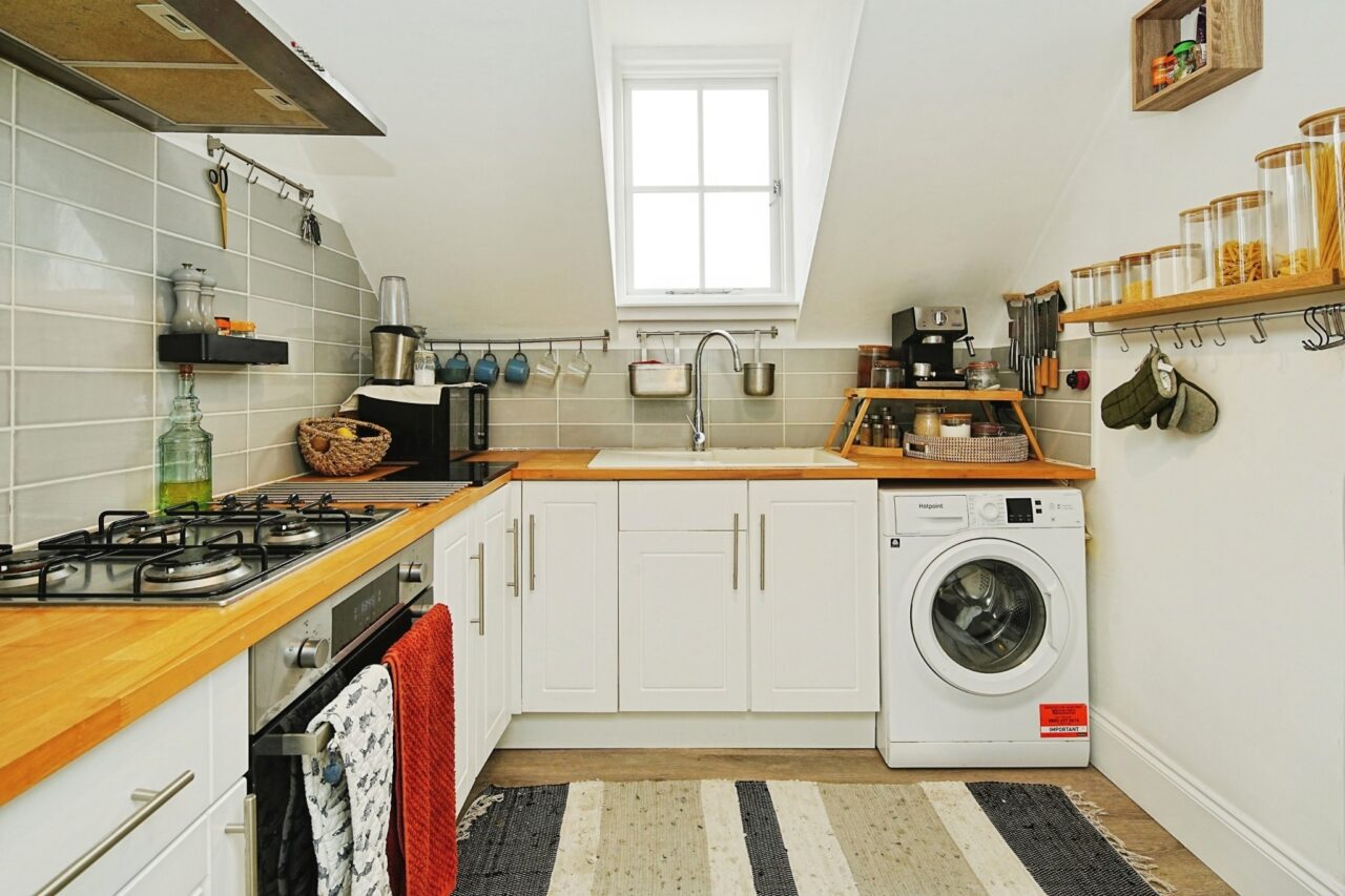 The living room enjoys a bright and airy feel, enhanced by large sash windows, and benefits from the morning sun. There is ample space for seating and a dining area. Next to the living room, the kitchen offers a good selection of base-level units, shelves and hooks, an electric oven, gas hob, washing machine and free- standing fridge freezer.