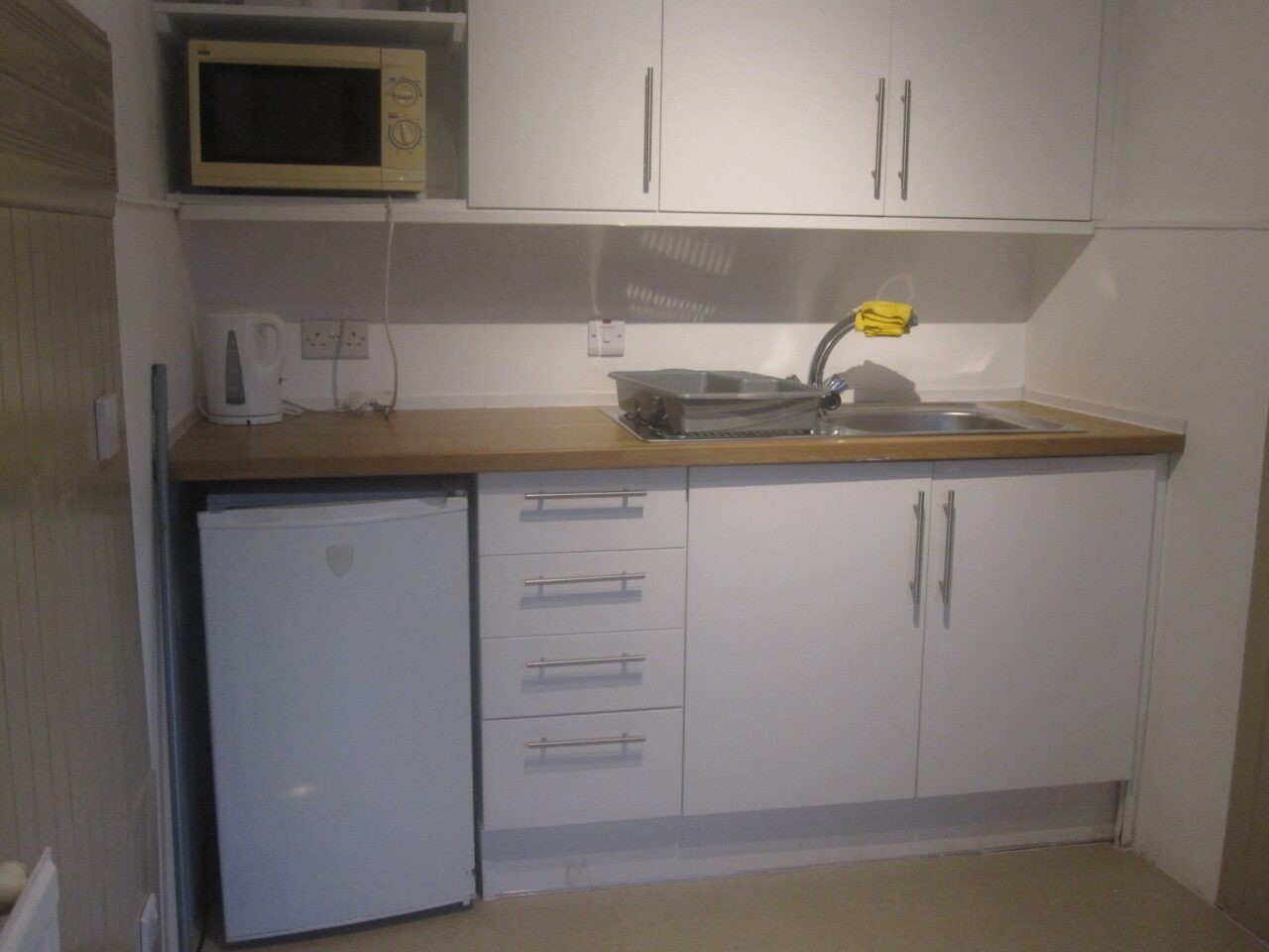 Communal kitchen with sink, units, fridge, microwave. Dining area.