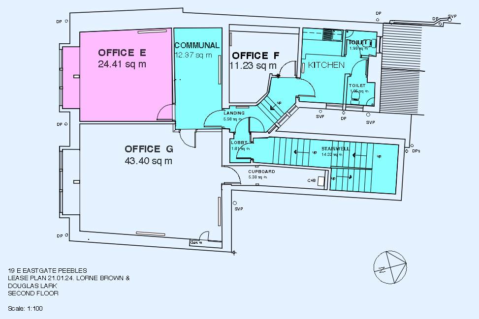 Office– 24.41 sq m (263 sq ft) with bay window looking south over Eastgate. Ample power sockets & good lighting. Central heating radiators.