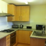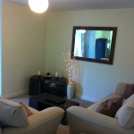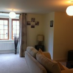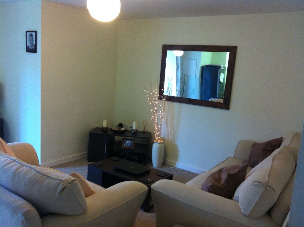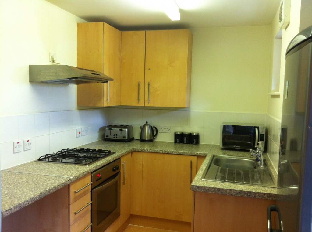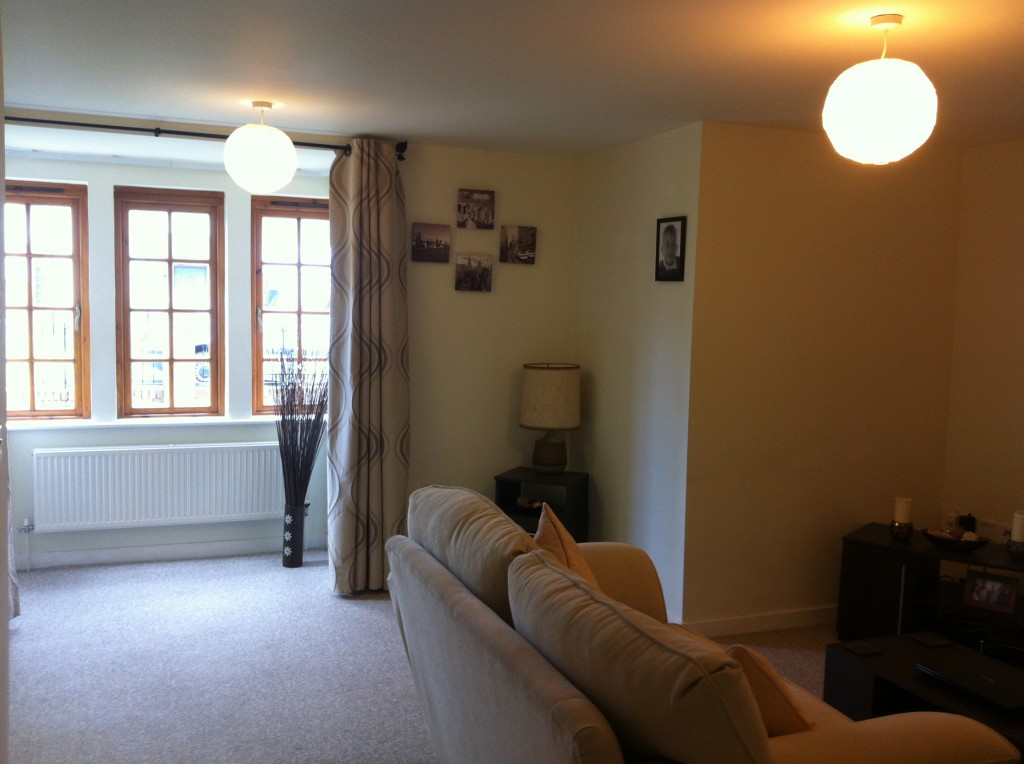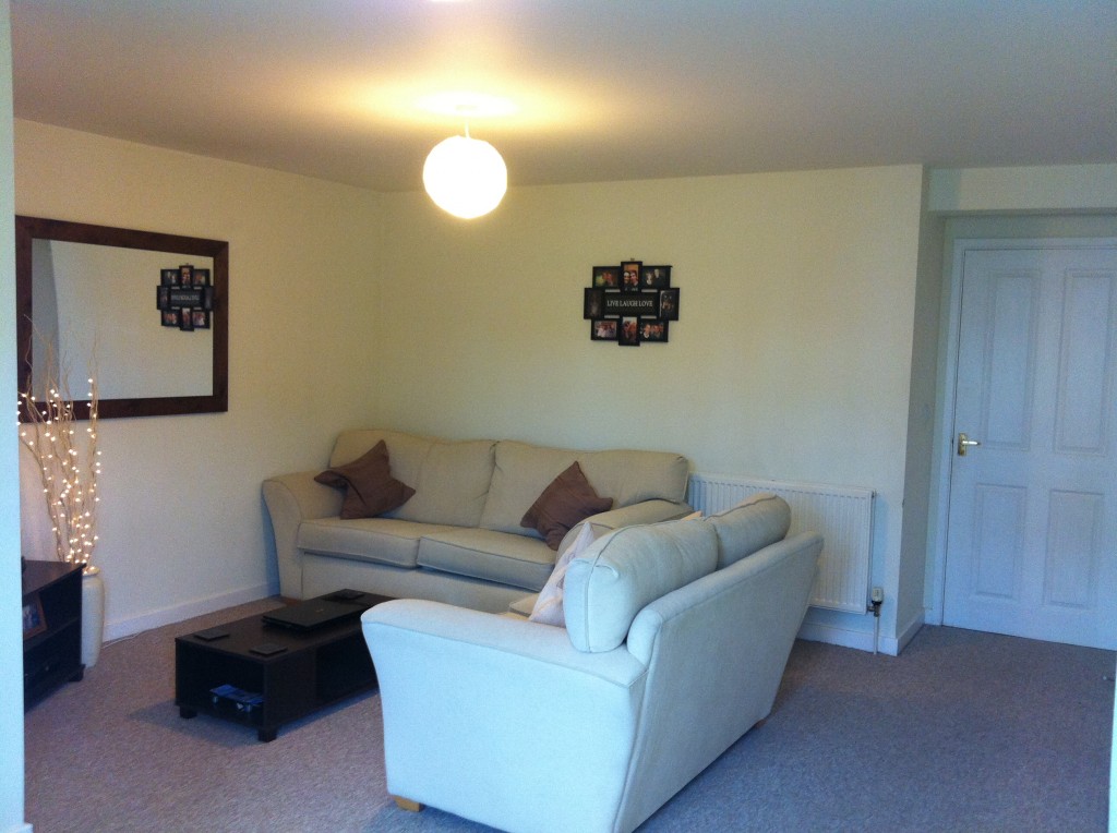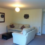 Large open plan lounge and dining area with bay window, the modern fully-fitted kitchen is tucked around the corner from the lounge; so has the advantage of being open plan but also contained. In addition, there is a large storage cupboard containing the washer/dryer.